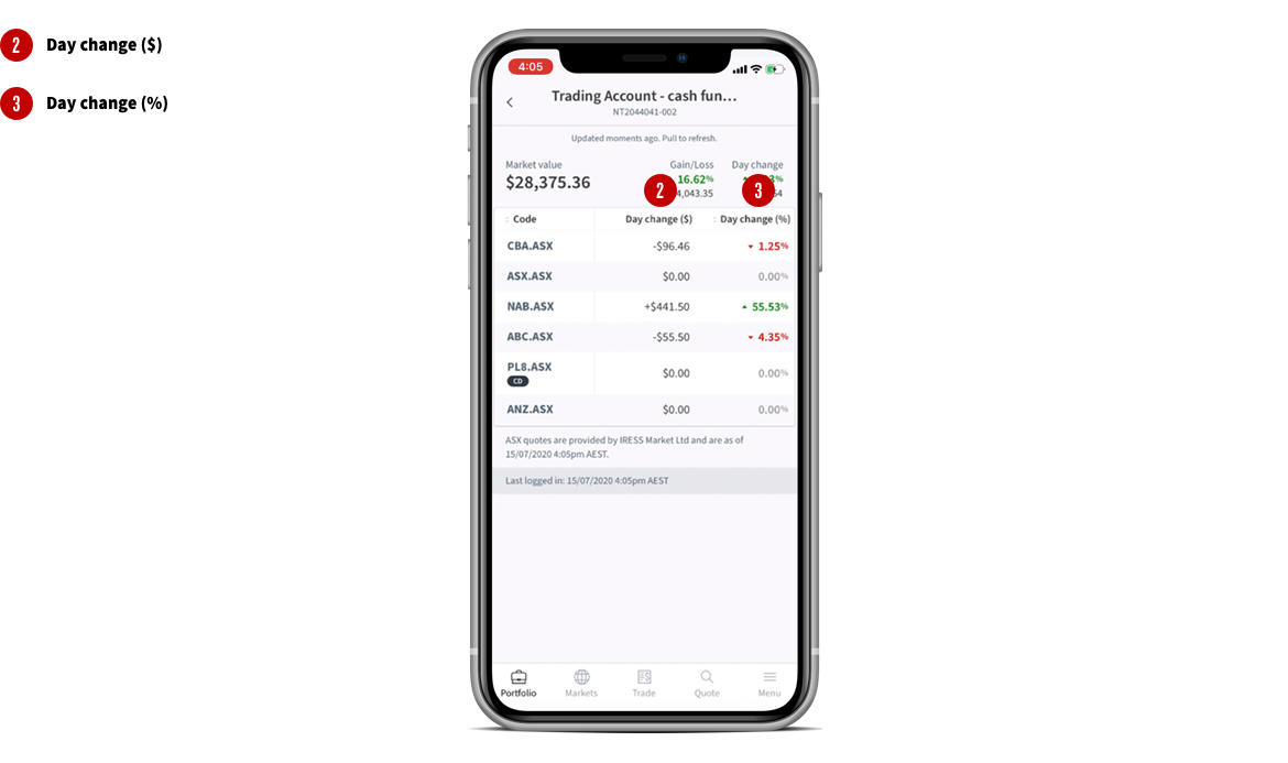 The default Portfolio page shows you a quick summary of your nabtrade portfolio (for a single legal entity) across domestic and international holdings and cash. You can also see the day's percentage change and gain/loss for the day at a portfolio level, and also by domestic and international holdings.