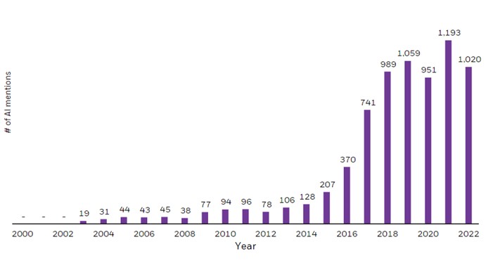 Source: FactSet. Accessed on 1/27/23. Transcripts reflect company commentary on earnings calls and investor day presentations. Chart Description: Bar chart reflects mentions of "artificial intelligence" in transcripts for S&P 500 companies dating back to 2000.