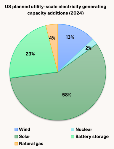 This strength is clear when looking at planned new additions to US electricity-generating capacity in 2024: 81% of this new, 62.8 GW of capacity was solar and battery storage, as shown in the following chart.