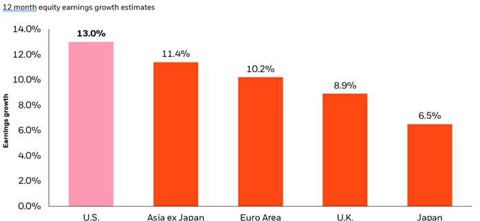 Earnings growth is expected to remain robust going forward, as seen in the chart below. Not only do US earnings estimates remain above other markets, they continue to be revised up – over the last three months analyst estimates for US equity earnings have risen 1.9% on average, compared to a 1.7% decrease for emerging market equities and 0.7% decrease for Japanese shares.8