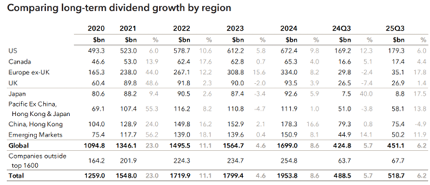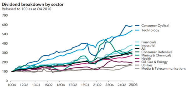 Capital Group analysed the dividend payments of the world’s largest 1,600 companies by market capitalisation (as at 31 March 2025), on a free float adjusted basis, using data supplied by Exchange Data International, supplemented by insight from company sources such as annual reports and results announcements and FactSet. FX data is also sourced from FactSet.