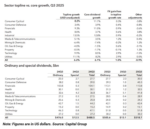 Global dividends continued their impressive run in the third quarter. They rose 6.2% year-on-year to US$518.7 billion on a topline basis, a Q3 record. The core dividend growth rate, which adjusts for one-offs, exchange rates and calendar factors, was very similar at 6.1%, though there was significant divergence between different geographies and sectors. The outcome in the third quarter was a little better than we expected, thanks mainly to greater strength than projected for Taiwan, Hong Kong and Europe ex-UK.