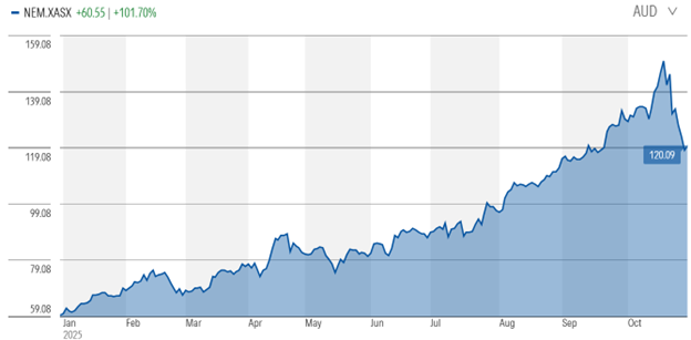 Newmont’s (ASX: NEM) third-quarter earnings were once again strong. Higher gold prices and reduced unit cash costs more than offset lower sales volume. Adjusted EBITDA rose about 70% to USD 3.3 billion, and the USD 0.25 quarterly dividend is unchanged. Shares were down 5% after the release.