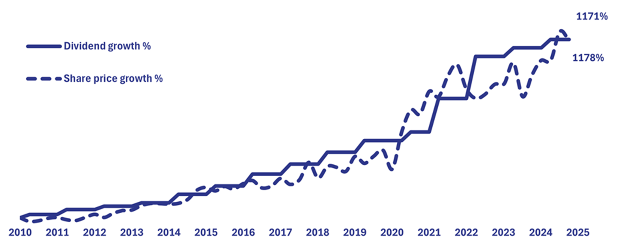 This graphic illustrates the stark experiential differences between the investor-friendly dividend-staircase journey versus the more volatile and erratic nature of the share price ‘rollercoaster’. Source: Roper Technologies Inc (NASDAQ: ROP) company filings and DivGro research. Roper Technologies Inc has been held in the DivGro Fund since inception.