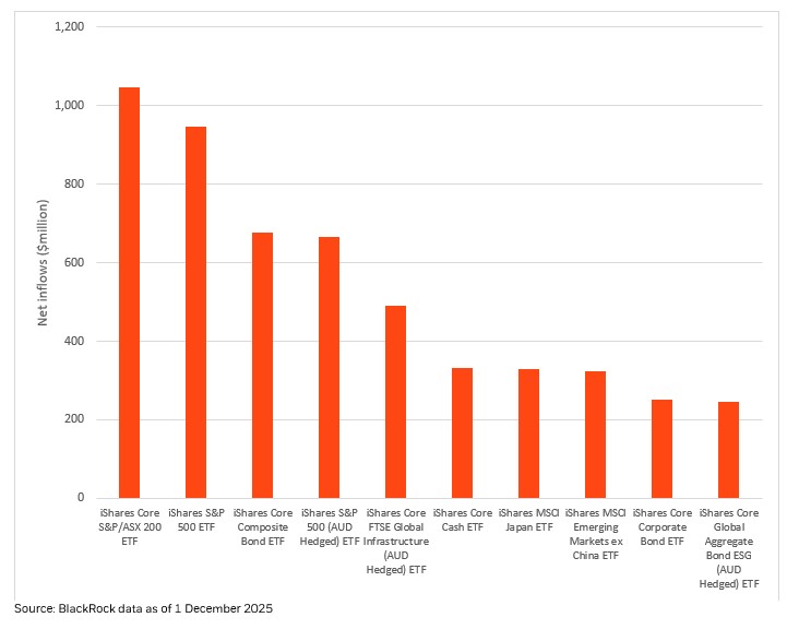 The iShares Core S&P/ASX 200 ETF (IOZ) was our most popular product on an inflow basis in 2025, gathering more than $1 billion from investors – compared to the iShares S&P 500 ETF (IVV) in second place with around $945 million of inflows, roughly half the amount the fund gathered last year.2