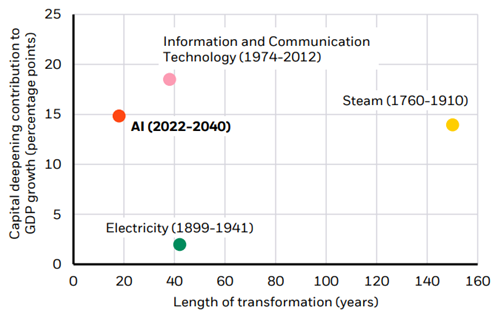 Forward-looking estimates may not come to pass. Source: BlackRock Investment Institute with data from Crafts (2021),December 2025. Notes: The chart shows the average annual contribution of capital spending to GDP growth for previous U.S. technologies (except “steam,” for the UK) against the length of time the capital was spent. Estimates for steam, electricity and ICT are taken from Crafts (2021). The spend needed for artificial intelligence (AI) is calculated using realized capital spending between 2022-2024, the upper end of the U.S.$5-8 trillion range of total capital spending intentions spanning the period 2025-2030, and an assumption that capex intensity continues at a similar rate through 2030-2040.