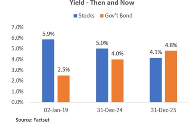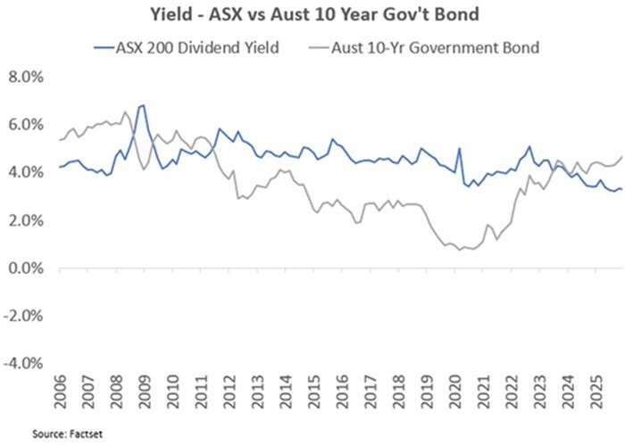 The low yield of the ASX is even more revealing when overlaying the yield of Australian 10-year government bonds. Notice in the next chart that the yield of the ASX has mainly exceeded the yield of 10-year government bonds – a sensical outcome given equities are riskier than bonds. However, since mid-2023 equity yields have tracked below government bond yields.