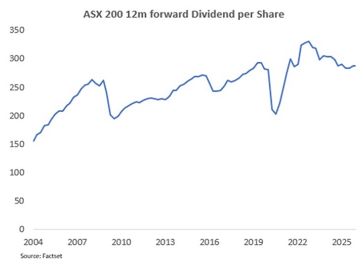 Unfortunately, the answer is no. The next chart plots the rolling 12m-forward dividend per share of the ASX 200. After a collapse then spike during the COVID-19 period, dividends have since retreated to be around 2019 levels. Also note the cyclical nature of the time series, which reflects dividend volatility from the two largest sectors of the ASX – banks and resources. Overall, unlike in the pre-GFC period when low yield sat alongside strong dividend growth, today it's low yield and low-to-no-growth.