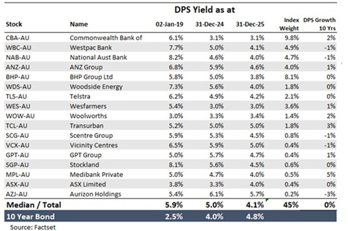 In the main, the decline in yield for the ASX comes from the big end of town being rated differently to a time ago. The table below lists 17 large cap companies known as reliable dividend payers. This group collectively accounts for 45% of the ASX 200. Note at the bottom of the table the weighted average yield of the basket (using today’s index weightings). Back in 2019, this basket yielded 5.9% (before grossing up for franking) vs the Aussie 10-year government bond yield at 2.5%. Fast forward to today and you get 4.1% dividend yield vs 4.8% for the 10-year bond. Upside down.