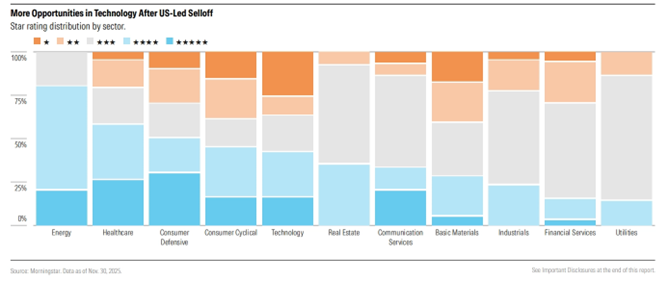 As for defensives, valuations have been trading at discounts to fair value on the back of sluggish sales growth. There has also been an increasing disconnect in price to fair value in the technology sector following the recent selloff in AI tech shares in the US.