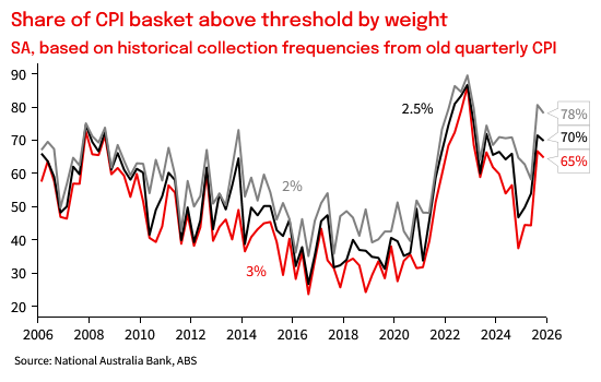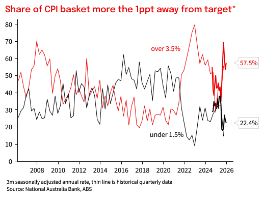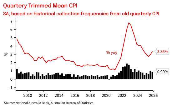 Q4 trimmed mean was 0.90% qoq and 3.35% yoy. That was above the RBA’s November SoMP forecast for 0.75%/3.16% and a realisation of the upside risk they had feared given the detail in the October and November Monthly CPI prints. Inflation in Q4 was once again broad-based, with consumer goods prices contributing a bit more than was evident in Q3, and housing and services inflation remaining elevated relative to H1 2025. On the old quarterly basis, 65% of the basket was annualising above 3% in Q4, above levels seen through 2023 and down only marginally from Q3.