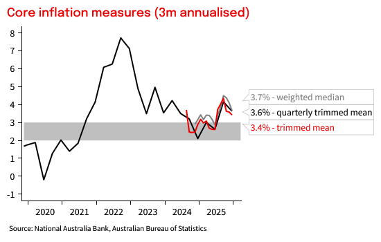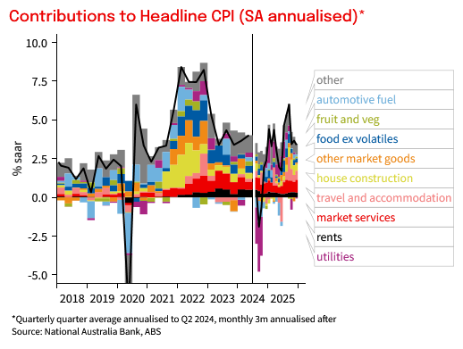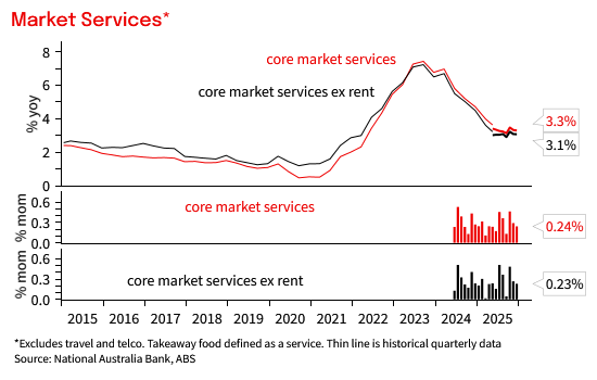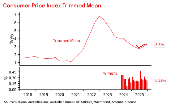 The monthly trimmed mean was 3.3% yoy (NAB and Consensus 3.3% yoy). One piece of more encouraging news, was the monthly trimmed mean increase of 0.23% mom, its slowest pace since June. It is still annualising above 3% on a 3m annualised basis.