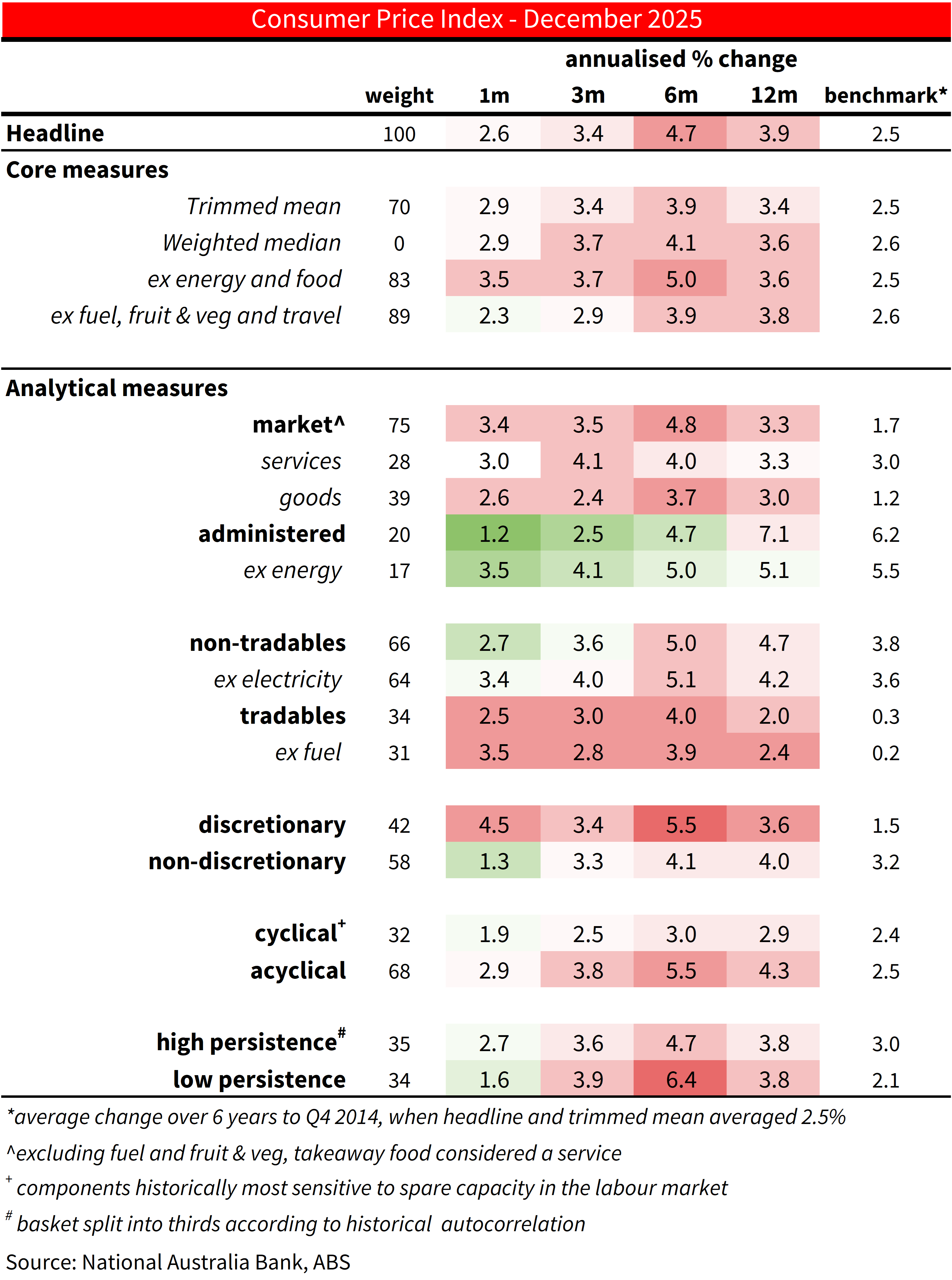 Table 1: CPI heat map with analytical measures. Shows 1- 3-, 6- and 12m annualised outcomes. Shading reflects how far inflation is above or below a benchmark of the 6 years to end 2014 when inflation averaged around the mid-point of the target