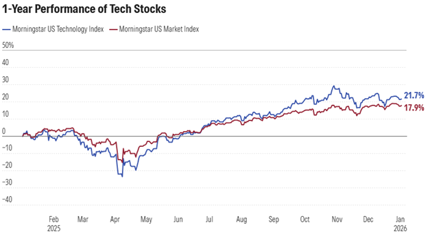 Over the past 12 months, the Morningstar US Technology Index rose 21.70%, while the Morningstar US Market Index gained 17.92%.