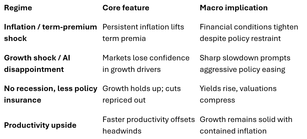 The year ahead can be framed around four plausible macro regimes, each with distinct market implications: