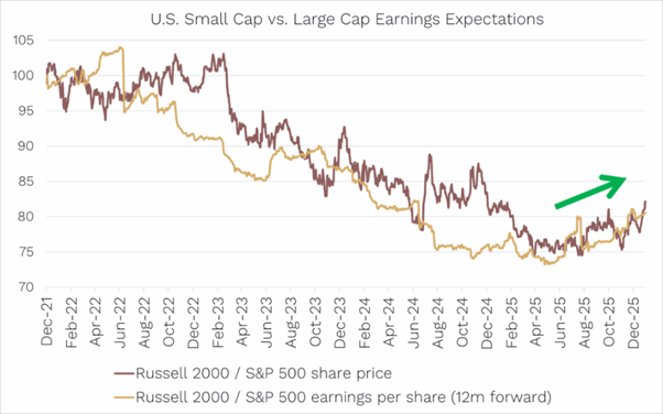 As with individual stocks, earnings are the primary long-term driver of index performance. From 2022 through to mid 2025, small-cap underperformance closely mirrored their relative earnings underperformance.