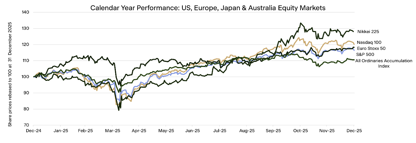 If you look only at the headline index numbers this year, 2025 looks fairly straightforward. The All Ordinaries Accumulation index has returned just over 10% for the year and the MSCI World Index approximately 20%, putting both modestly above long-term equity returns of 7-8% per annum. On the surface it looks like a decent, if unspectacular, year. Under the surface, it was far more eventful.