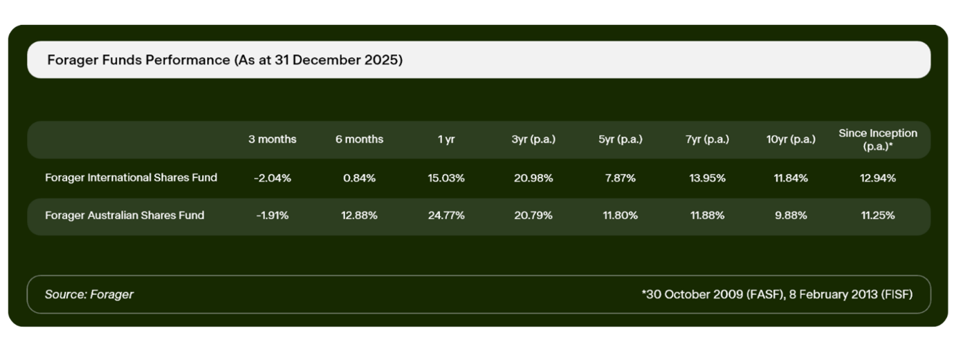 All prices and analysis at 13 January 2026. This document was originally published in Livewire Markets on 13 January 2026. This information has been prepared by Forager Funds Management Pty Ltd and authorised for release by The Trust Company (RE Services) Limited (ABN 45 003 278 831, AFSL No: 235150) as the responsible entity and the issuer of the Forager Australian Shares Fund (ARSN No: 139 641 491) and the Forager International Shares Fund (ARSN No: 161 843 778).. The content is distributed by WealthHub Securities Limited (WSL) (ABN 83 089 718 249)(AFSL No. 230704). WSL is a Market Participant under the ASIC Market Integrity Rules and a wholly owned subsidiary of National Australia Bank Limited (ABN 12 004 044 937)(AFSL No. 230686) (NAB). NAB doesn’t guarantee its subsidiaries’ obligations or performance, or the products or services its subsidiaries offer. This material is intended to provide general advice only. It has been prepared without having regard to or taking into account any particular investor’s objectives, financial situation and/or needs. All investors should therefore consider the appropriateness of the advice, in light of their own objectives, financial situation and/or needs, before acting on the advice. Past performance is not a reliable indicator of future performance. Any comments, suggestions or views presented do not reflect the views of WSL and/or NAB. Subject to any terms implied by law and which cannot be excluded, neither WSL nor NAB shall be liable for any errors, omissions, defects or misrepresentations in the information or general advice including any third party sourced data (including by reasons of negligence, negligent misstatement or otherwise) or for any loss or damage (whether direct or indirect) suffered by persons who use or rely on the general advice or information. If any law prohibits the exclusion of such liability, WSL and NAB limit its liability to the re-supply of the information, provided that such limitation is permitted by law and is fair and reasonable. For more information, please click here.