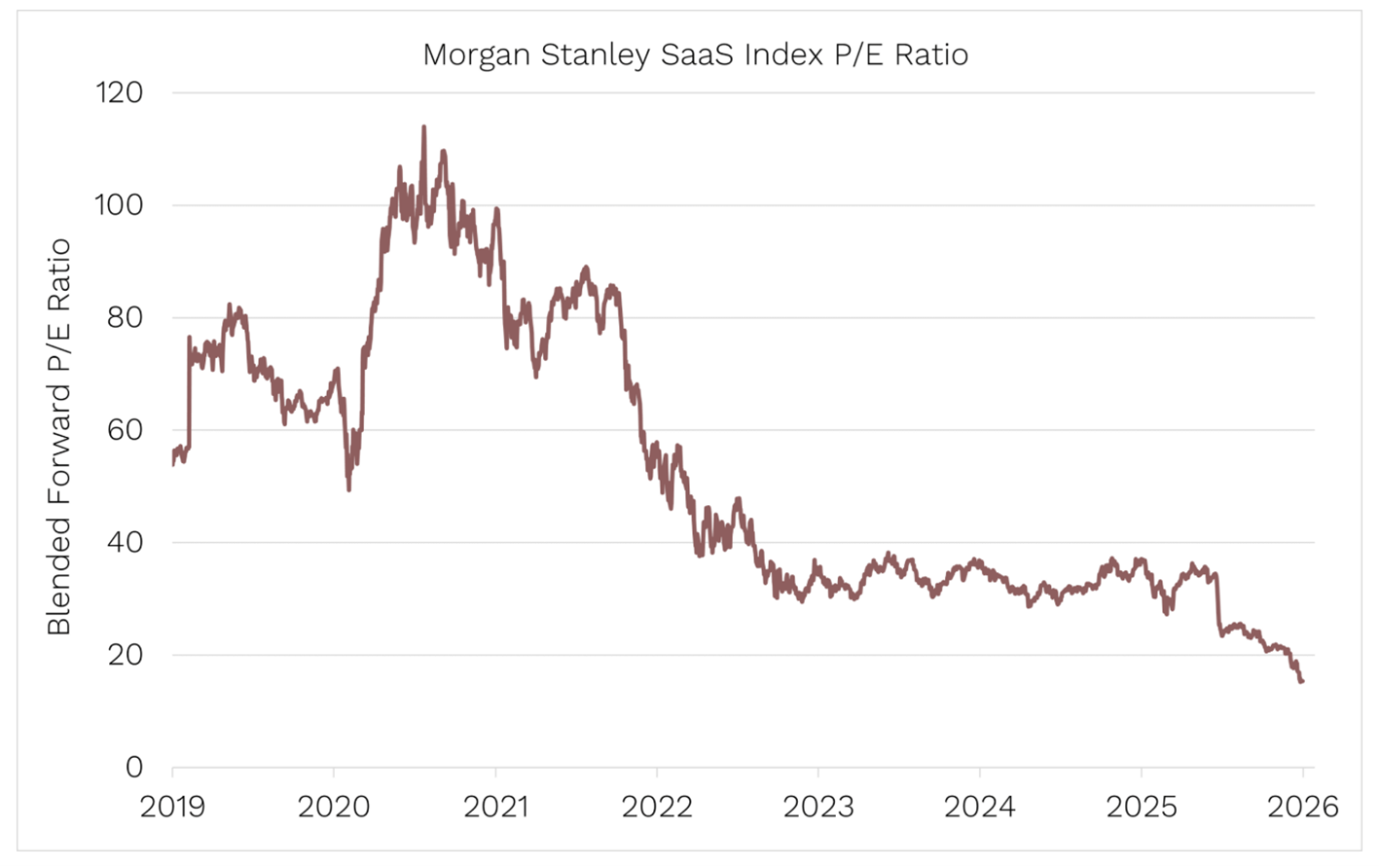 When long-duration stocks lose revenue predictability, multiples compress quickly. Morgan Stanley’s SaaS index forward earnings expectations are now trading on ~15x, compared to a 30-40x range since mid-2022.