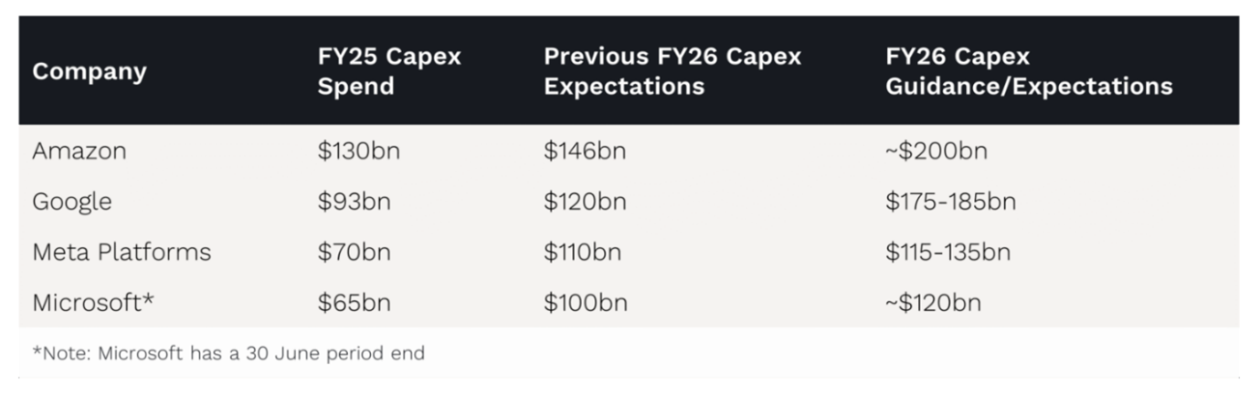 In their recent results, all of these companies provided capex guidance for 2026 that was well above market expectations.