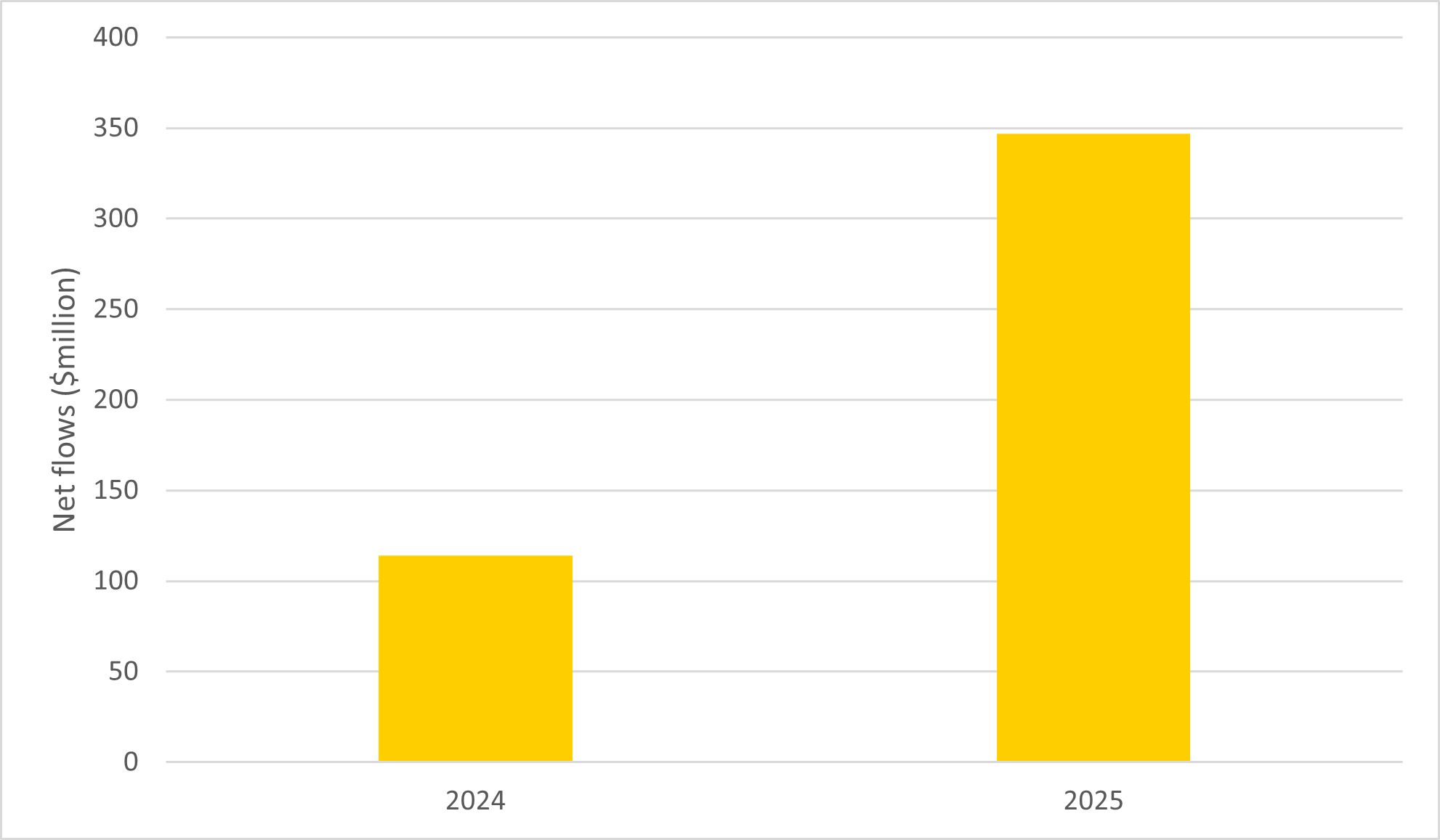 They also drove buoyant inflows to Japanese equities among Australian investors, with the iShares MSCI Japan ETF (IJP) gathering over $360 million in net flows last year – more than triple the fund’s 2024 flow numbers.2