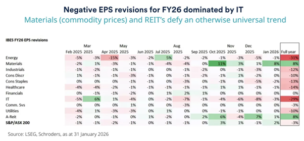 The obvious retort to any suggestion of a convergence in multiples between sectors, towards a level more consistent with what has been observable for much of recent decades, is to point to the difference in earnings growth expectations. Alas, as is often the way, price is what you pay and value is what you get. It is one thing to expect magnificent earnings growth; it is yet another to have it delivered. In the US, IT stocks have largely delivered on earnings growth expectations. That has not been the case in Australia, and the shortfall against expectations has been as large as Ben Duckett’s during the recent Ashes tour. As a case in point; IT on the ASX200 has seen a 29% reduction in F26 eps estimates through the past year, with only Energy (-31%) faring worse. In contrast, REITs and Materials (8%) have seen F26 earnings revised up through the past year, and in the case of Materials this is purely due to commodity price increases driving revenues (as costs have continued to rise faster than initial expectations).