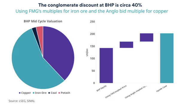 The bigger opportunity for the major miners, in our opinion, in pursuing an M&A agenda driven by the creation of value, is to break themselves up. As our learned colleague Mr Halliwell has highlighted, taking Fortescue’s multiple for iron ore and the multiple used for the Anglo bid and applying them to the relevant segments within BHP were they to be listed as pure play commodity entities, would see 40% upside for BHP, which is an enormous value driver for what during January became the biggest stock listed on the ASX. A similar break up value exercise, with also material upside, can also be undertaken for RIO. The prospect of either pursuing a transaction of this type is remote, but it should be the counter factual that is measured against before either executes on their seemingly primeval urge to undertake any further large-scale acquisitions at high multiples of book value.