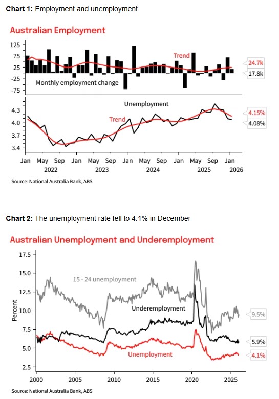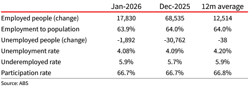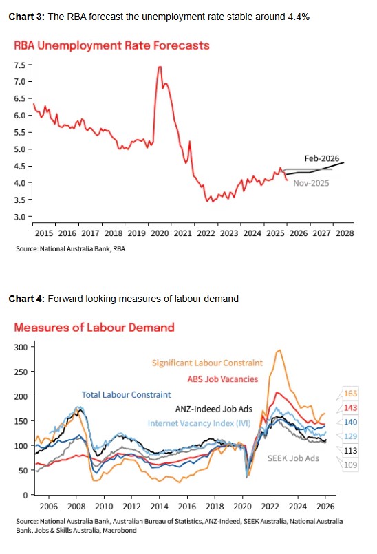 The RBA forecast the unemployment rate averaging 4¼% over the first half of 2026. Today’s outcome won’t be a material surprise to that forecast but will reinforce that some further tightening in policy will be required. NAB continues to expect the RBA will hike rates in May, noting that the risk skews to an additional hike or a longer period of rates on hold relative to our baseline forecast.