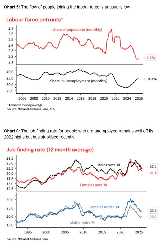 While the unemployment rate was steady at 4.1% in January, some other indicators of underutilisation did at least partially retrace their December fall. Underemployment rose 0.2ppts to 5.9% partially retracing the fall from December to be in line with the 12-month average. Youth underemployment rose 1.0ppt almost fully retracing the fall from December. Even so, both remain well below pre-pandemic levels,