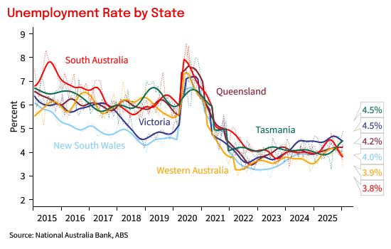 By state, the unemployment rate is at or below 4% in SA, WA and NSW. Labour markets in QLD, WA and SA remain substantially tighter than they were pre-pandemic.
