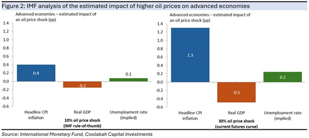 Some central banks might release their modelling this week, but the IMF recently published its estimated impact of an oil price shock for advanced economies. Scaling the IMF analysis, a roughly 30% increase in the price of oil – which is what is currently factored into the futures curve for the rest of this year – would boost headline inflation by about 1¼pp. The risk to headline inflation seems greater this time around because the closure of the Gulf is likely to affect food prices via the reduced supply of fertiliser and goods prices via the lower supply of key industrial chemicals.