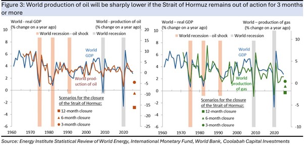 More generally, a sustained reduction in the world supply of energy points to an increased risk of recession. The world economy has become less dependent on oil over time, but growth in world GDP is still highly correlated with growth in the global production of both oil and gas, such that a long blockade of the Gulf would raise the risk of recession.