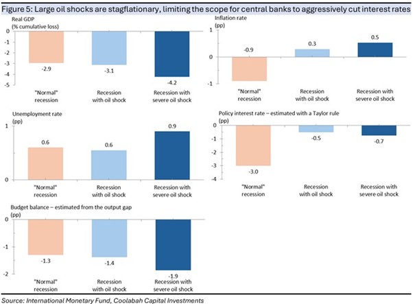 If a recession is realised, an IMF study of business cycles shows that recessions associated with oil shocks are stagflationary, with both higher inflation and higher unemployment. In a “normal” recession, a central bank cuts rates aggressively, usually from a starting point of high interest rates. Stagflation greatly complicates things and a simple policy rule based on the usual increase in inflation and unemployment seen in an oil shock points to little change in interest rates.