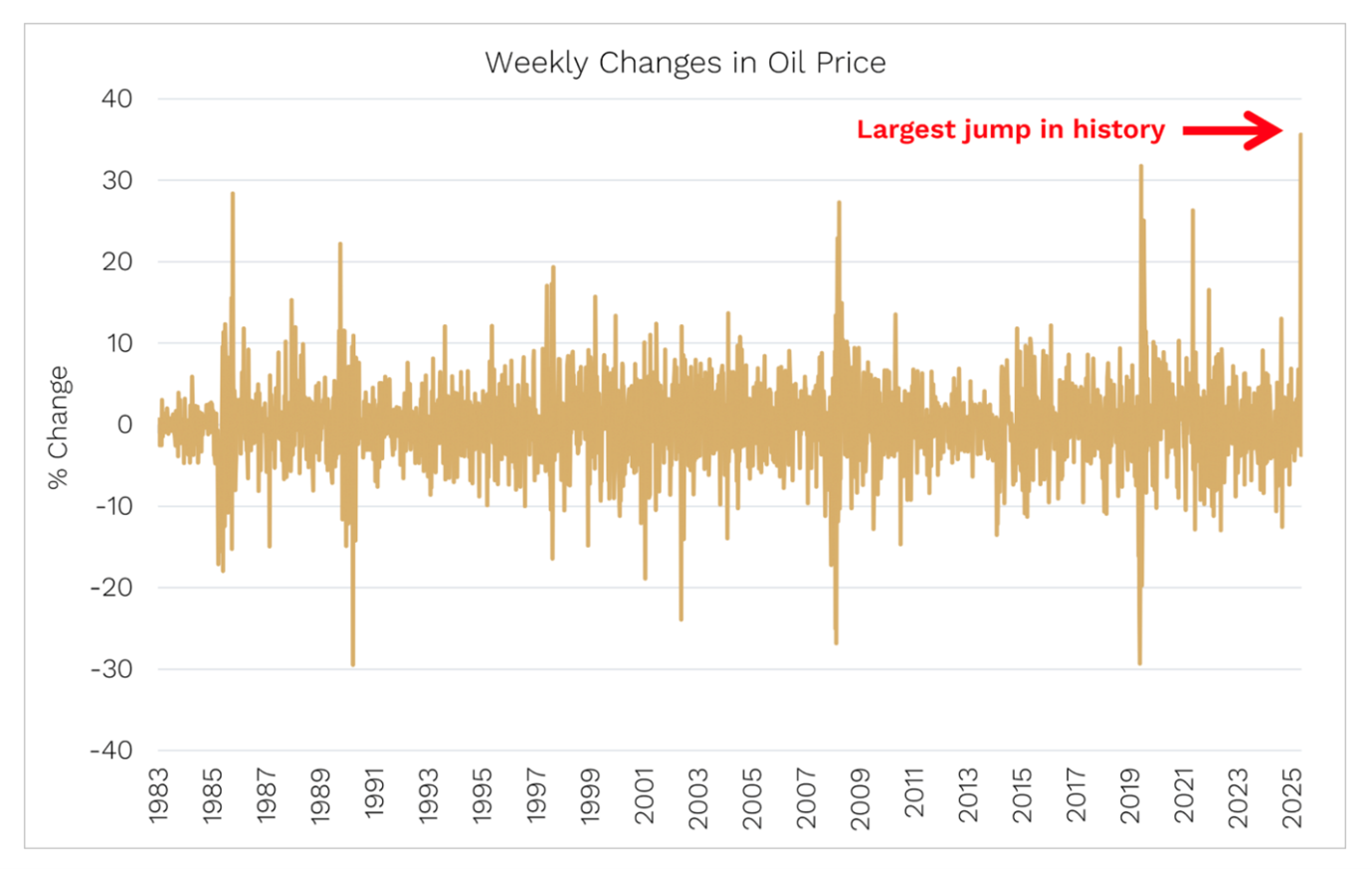 While the first Gulf War may take the record (so far) for the largest percentage jump in the oil price since 1980, today’s war has seen the fastest – one week in early March recorded the biggest weekly jump in the oil price ever!