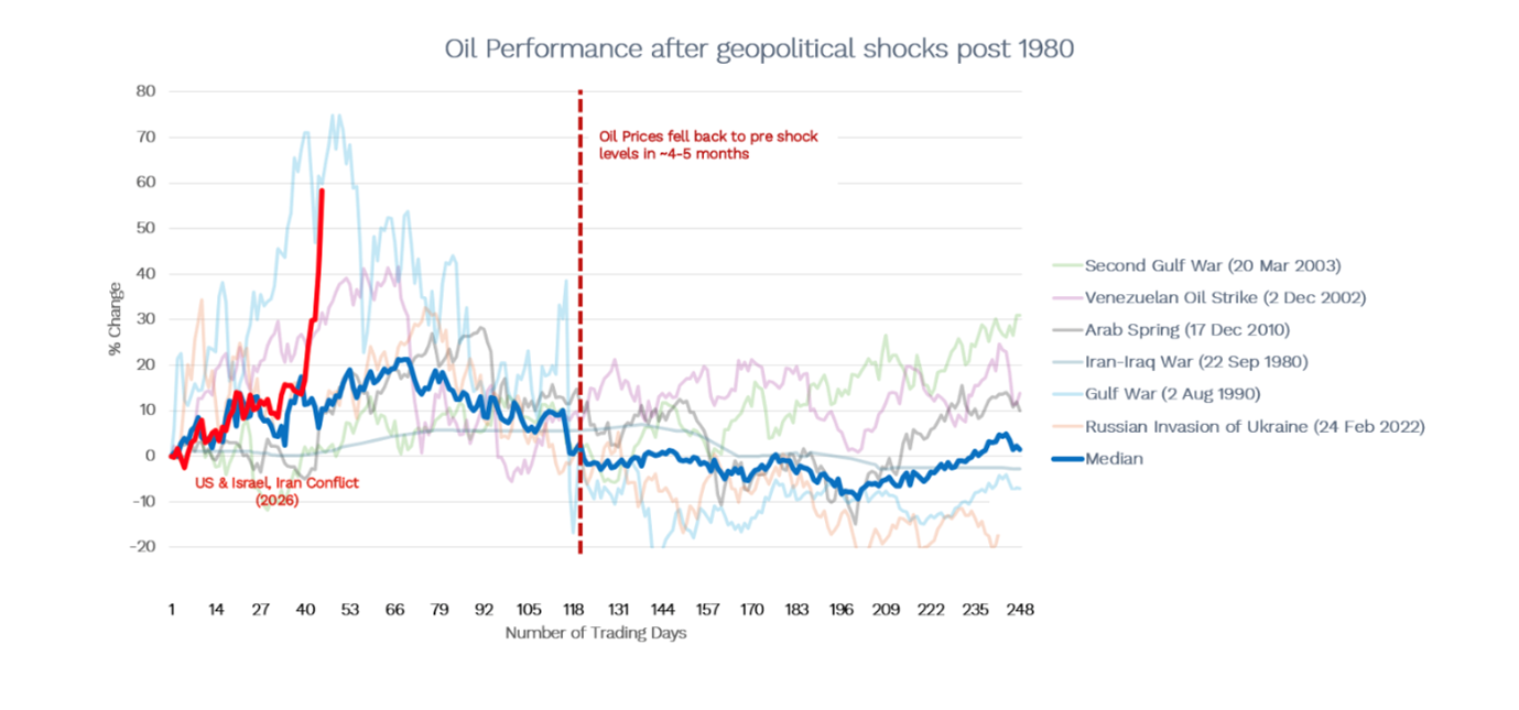 If fears around the impact of the war on Iran’s oil supply are just that, fears, then we can use the median pathway of 4-5 months for prices to fall back to pre-shock levels as our roadmap.