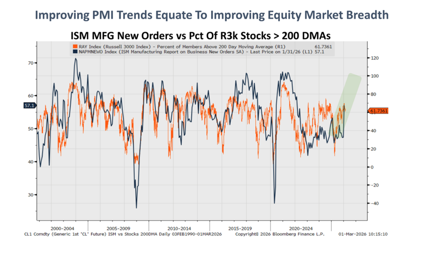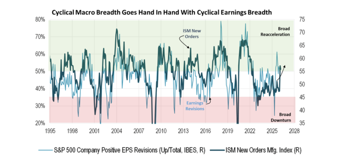 The chart below illustrates the Institute of Supply Management’s (ISM) PMI of New Manufacturing Orders in dark blue and the breadth of S&P 500 company earnings revisions.