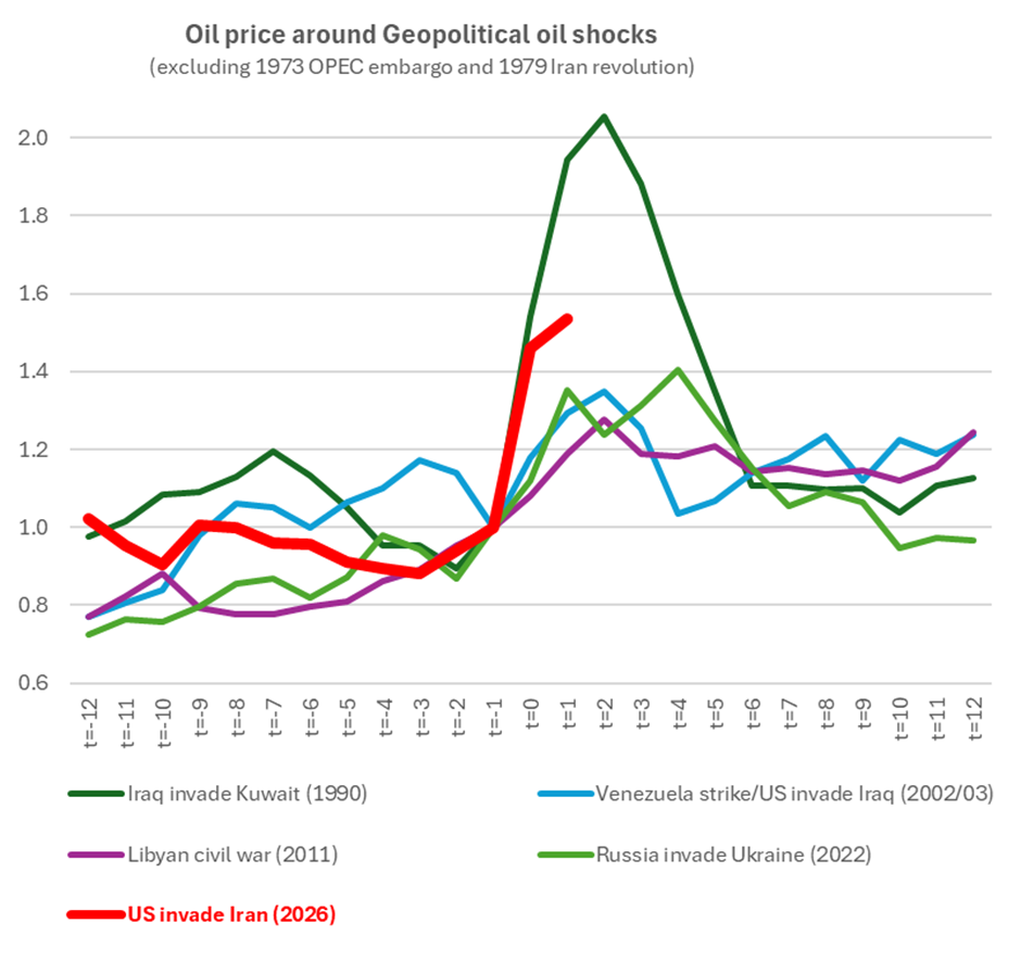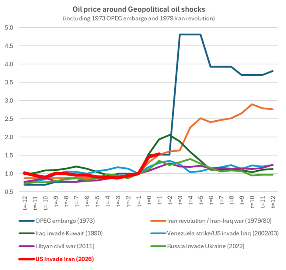 Note: Each line shows the oil price indexed to 1.0 at the trigger month. A reading of 2.0 means the price doubled; 0.5 means it halved. The x-axis shows months before and after, allowing each crisis to be compared on the same scale regardless of the absolute price level at the time.