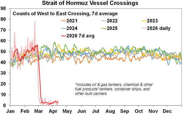 For now, the Strait remains the key, because the last ships that made it through at the end of February are now reaching their destinations, meaning refineries in Asia will soon start to run low on oil to refine. So the resultant 10-15% hit to global oil supply (after allowing for diversions, eg, via the Saudi East-West tunnel) will start to bite this month. All of which risks a renewed surge in oil prices, to maybe around $US150/barrel in order to curtail consumption, and plunging share markets.