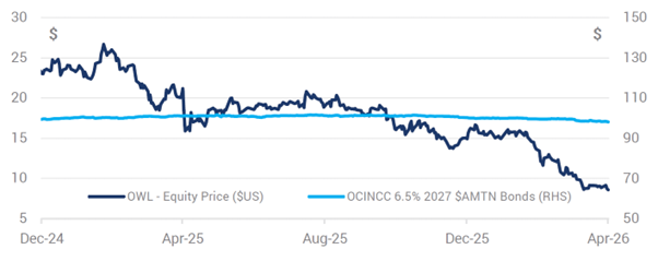 OWL’s share price is now down two-thirds from its peak in early 2025. By contrast, OWL’s Credit Income Fund $A bonds, which are effectively secured against the fund’s underlying assets, are less impacted and continue to hold their value (refer Chart 1). These bonds are protected by a significant equity cushion, with fund leverage at just ~0.7x, redemptions gated and a BDC mandated leverage covenant limit in place of 2x.