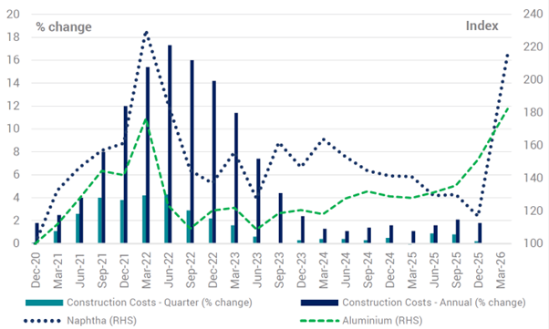 This brings us back to the current Iran conflict and the impact of inevitable cost escalations and higher interest rates on construction sites across Australia. Already weakened through the 2022/23 period of higher interest rates and cost escalations, property development/construction is enduring another round of higher costs (refer Chart 2) and constrained demand. For instance, since the commencement of hostilities, naphtha and aluminium prices – key components in plastic and metal building products – have increased by 85% and 20% respectively. Moreover, in being highly correlated (i.e. increased costs impact all developments similarly), a diversity of development exposures might offer only limited protection from credit losses given the systemic risk profile.