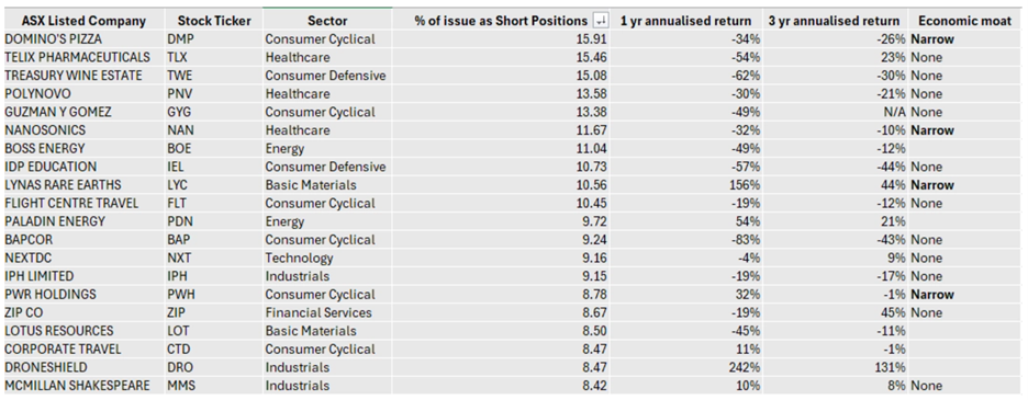 Domino’s (ASX.DMP) is one of eight companies that have remained on the most shorted list year on year. The shares have fallen over 80% since its COVID peak and 34% over the past 12 months. More recently, shares fell 11% following the company’s February earnings result. The fast food chain saw a slight decline in sales although profits were steady. The bear argument is that the company faces execution risks in international markets and rising competition. This alongside a recent leadership overhaul are key reasons why short sellers are continuing to take interest in Domino’s.
